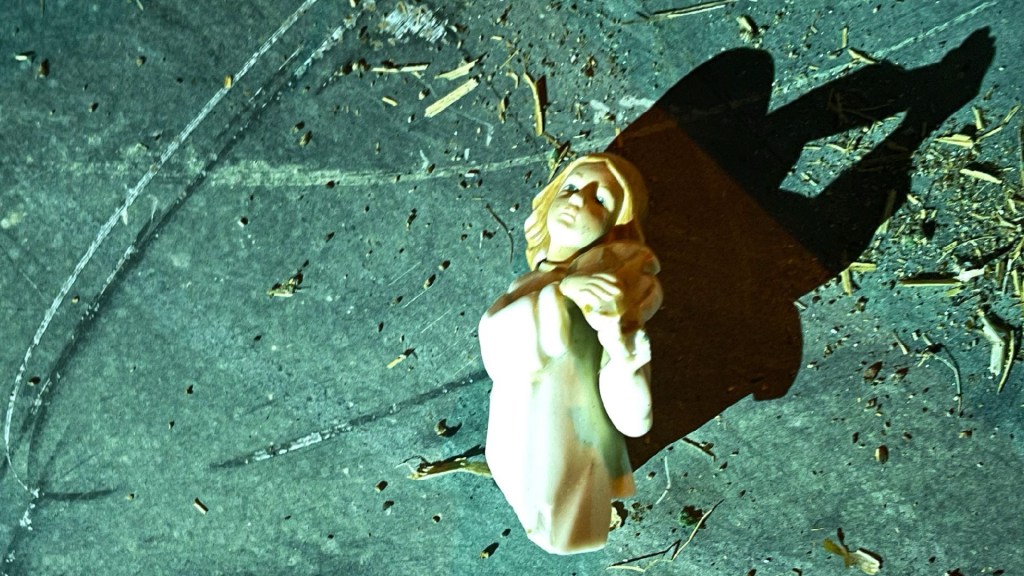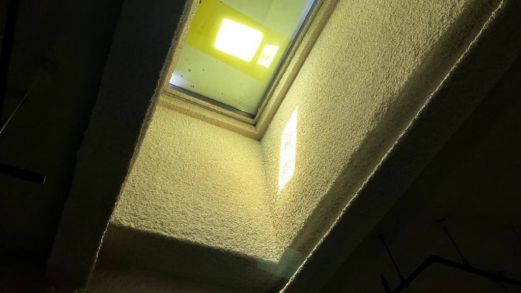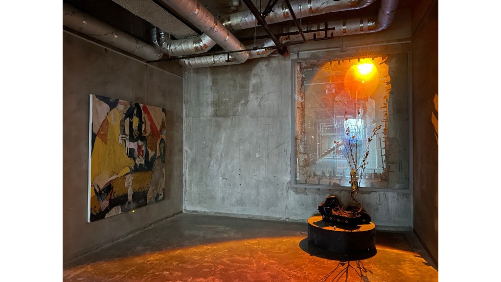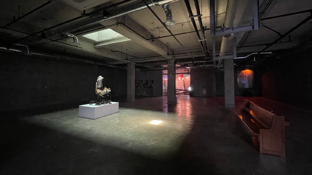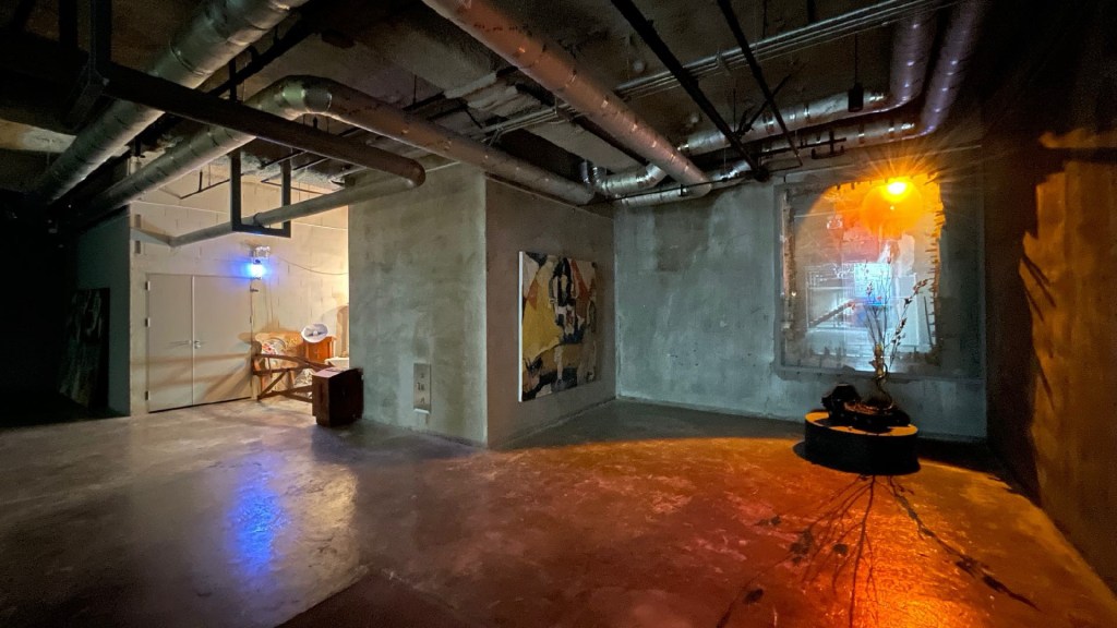 The centerpiece work, A Woman Holding an Injured Vampire Deer, was installed directly under the natural light shaft. The window above had been deliberately minimized, and over it the artist had affixed torn industrial tape forming the faint word “salvation.” As the sun rose and set, the shadow of this word slowly traced a circular path across the floor, evoking a quiet sense of ritual and reverence. Yet the moment one squinted to discern the source of that light, the sensation of belief was overtaken by reflective doubt. Rather than offering explicit explanations, the artist let the visual experience and passage of time speak for themselves, allowing meaning to emerge organically within the space.