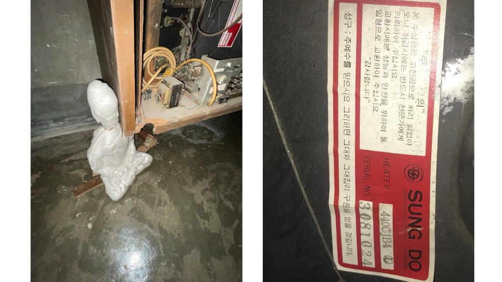 Wastes for Quasi-Religious Experience was held at Gosaek Newseum in Suwon. The venue, once an industrial wastewater treatment facility, has been repurposed as an exhibition space, and its physical structure and former function resonate with the symbolic language of Park Chulho’s work. Actively engaging with the site’s industrial legacy, the artist removed all artificial lighting and used only the natural light filtering in through small windows in the ceiling to illuminate the exhibition. The combination of waste materials, the enclosed underground space, and the restrained light transformed the exhibition into a quasi-religious experience.
