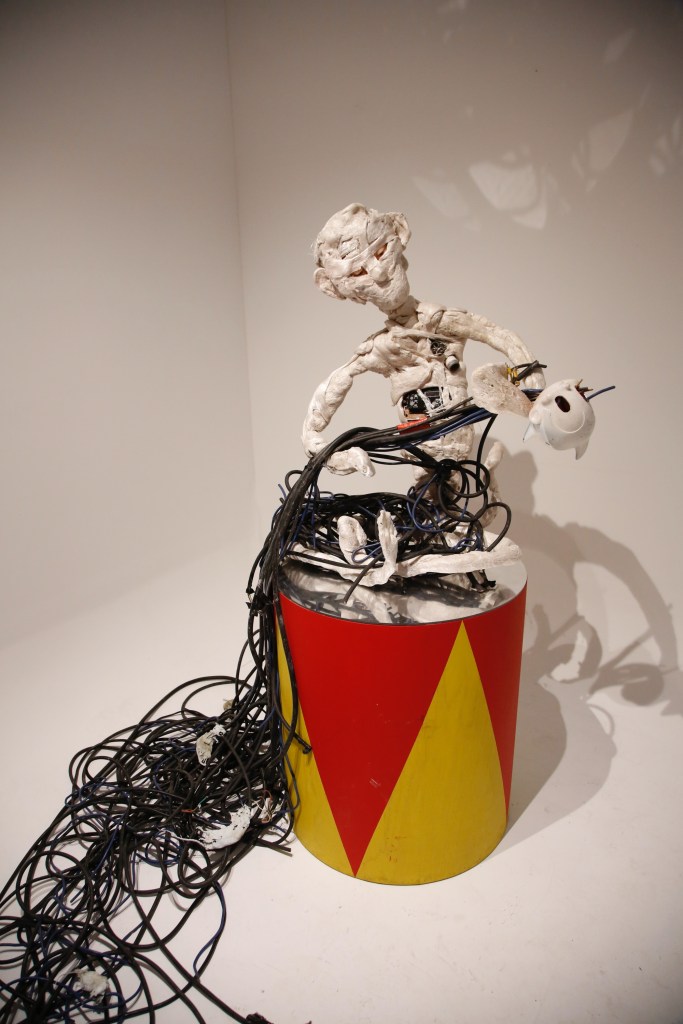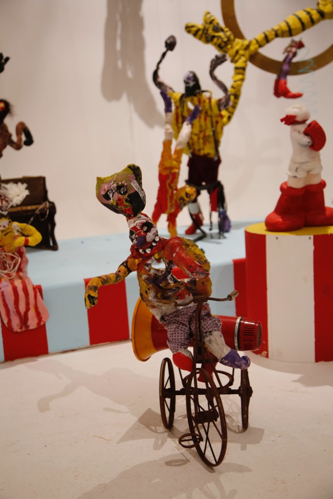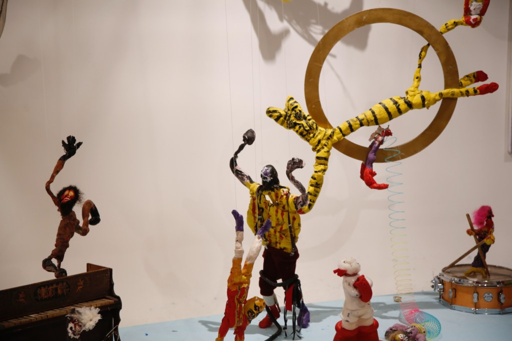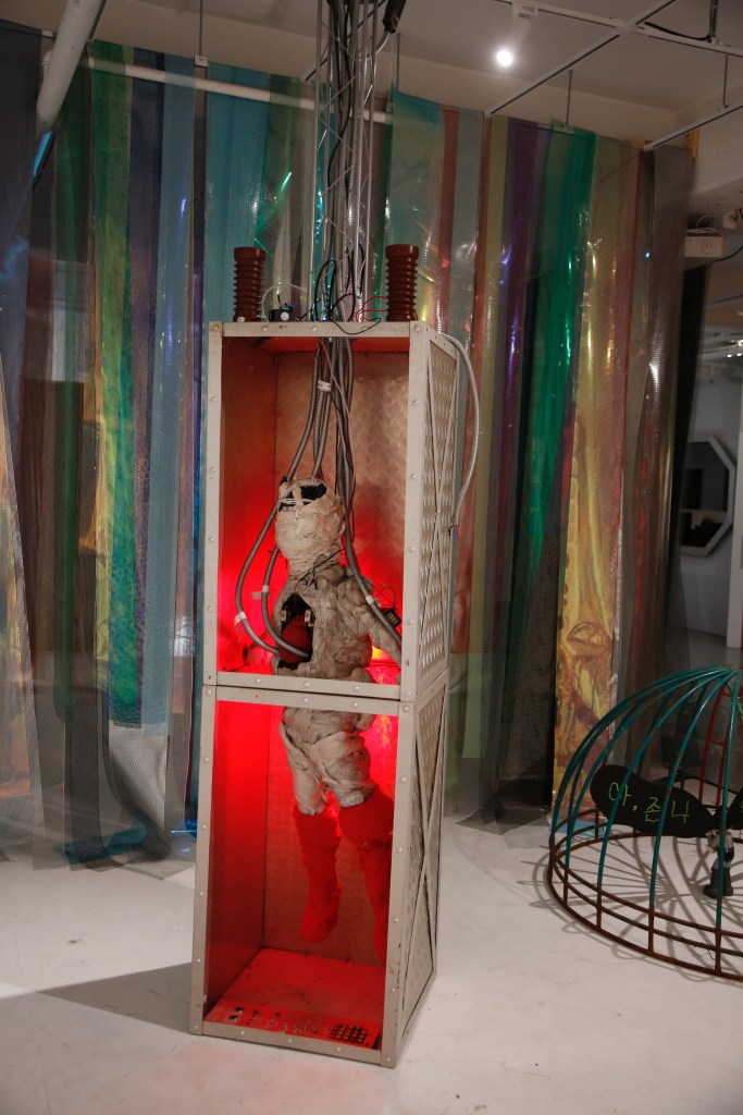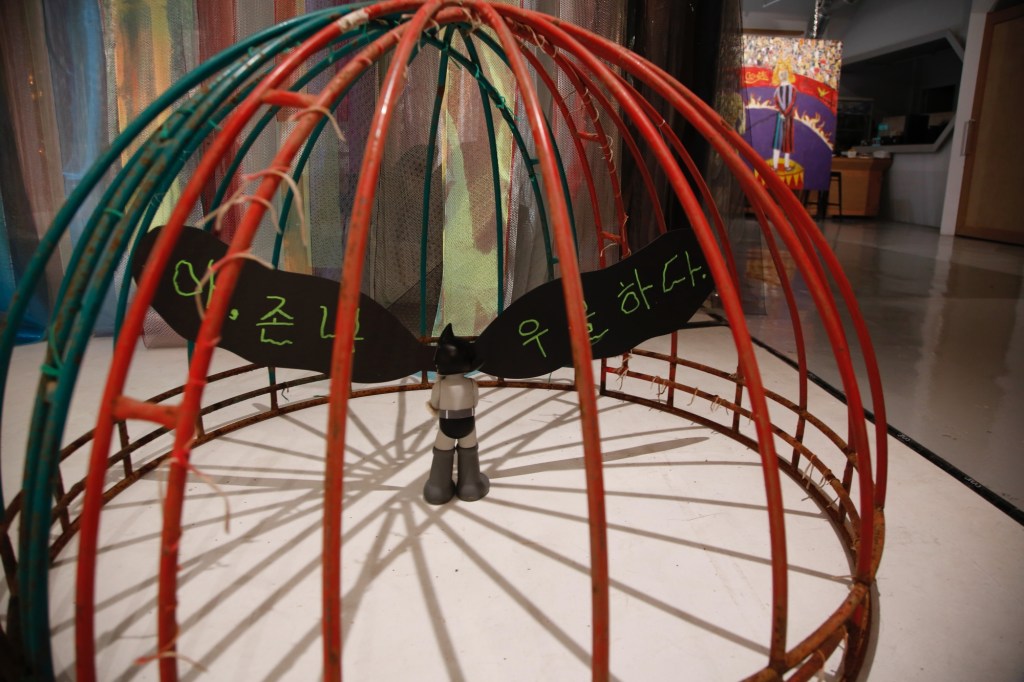 Although inspired by Osamu Tezuka’s Astro Boy, particularly its “Circus” episode, Park’s exhibition is far from a mere homage. It is a complex structure that spans affect, disability, technology, and emotion in the contemporary context. His encounter with artist Hyunwoo Kim, who lives with a developmental disability, profoundly shaped the narrative foundation of Atomic Boy. Kim’s sculptural language—rich with imagined worlds, affective intensity, repetition, and immersive rhythm—became the seed for a world where robots rehearse emotion and perform failure in a surreal circus. In this world, emotion is engineered, sentiment is staged, and depression becomes a conceptual motif. The phrase “Falling down is what makes us human” encapsulates the paradox of machines simulating humanity by performing its most fragile acts.